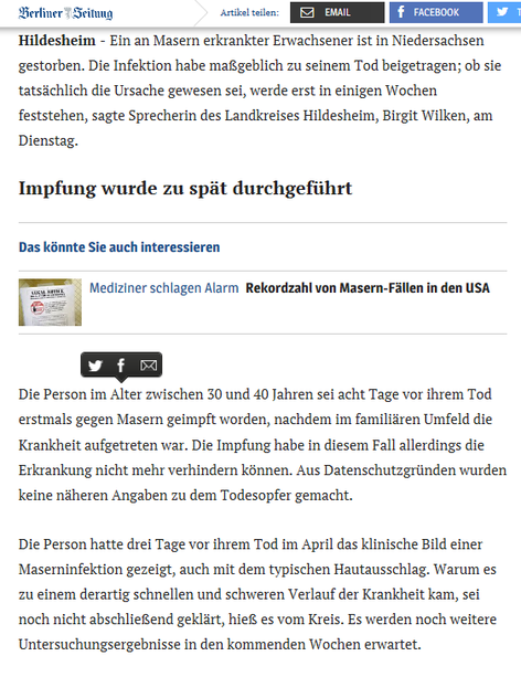 „Hildesheim - Dorosła osoba cierpiąca na odrę zmarła w Dolnej Saksonii. Zakażenie przyczyniło się znacząco do jej śmierci; czy rzeczywiście było przyczyną, będzie znane dopiero za kilka tygodni, powiedziała rzeczniczka dzielnicy Hildesheim, Birgit Wilken, we wtorek.