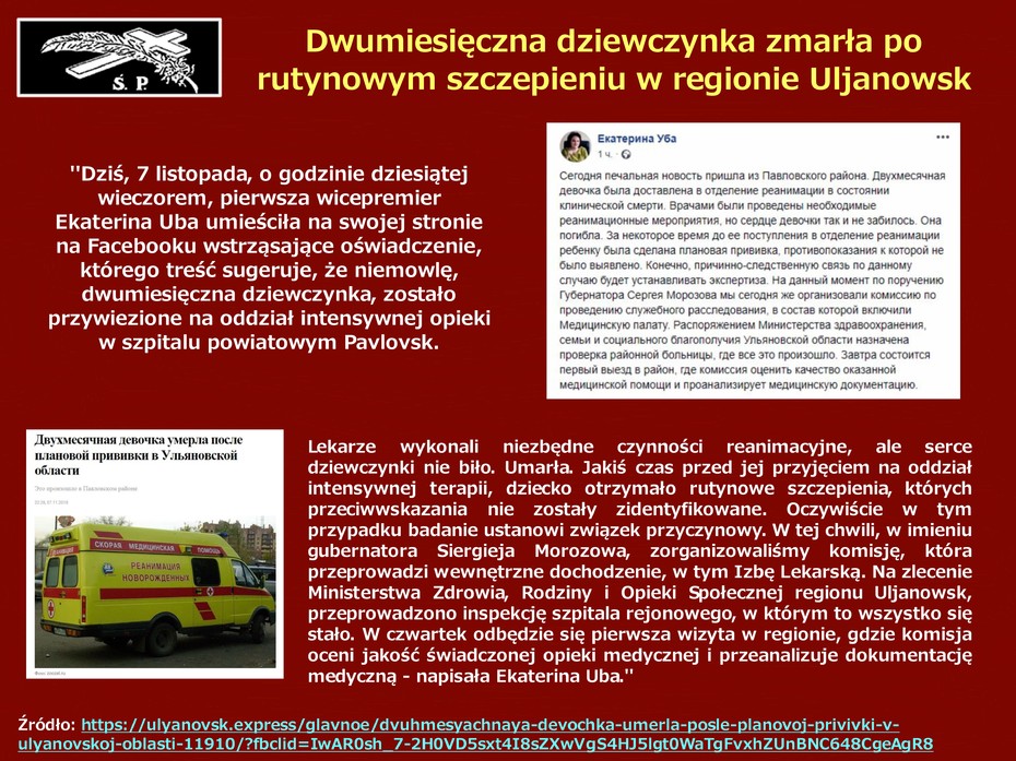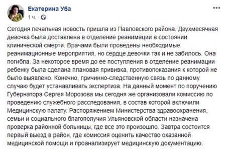 Ekaterina Uba umieściła na swojej stronie na Facebooku wstrząsające oświadczenie, którego treść sugeruje, że niemowlę, dwumiesięczna dziewczynka, zostało przywiezione na oddział intensywnej opieki w szpitalu powiatowym Pavlovsk.