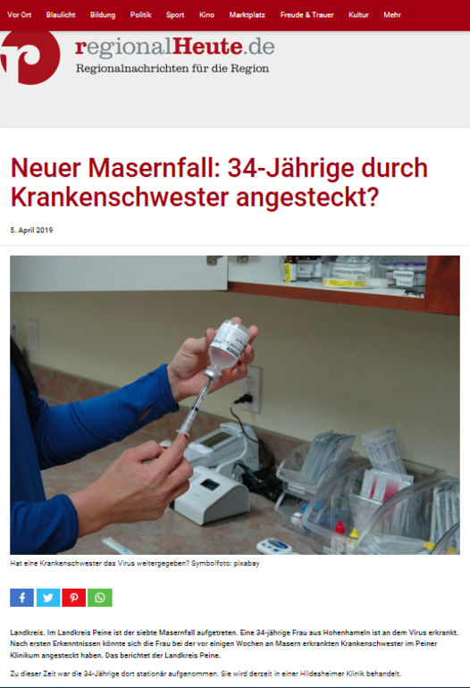 W Landkreis Peine (okręg Peine) pojawił się siódmy przypadek odry. 34-letnia kobieta z Hohenhameln zachorowała na tego wirusa. Według wstępnych ustaleń kobieta mogła zostać zainfekowana przez pielęgniarkę w Klinice w Paine, która zachorowała na odrę kilka tygodni temu. Tak poinformował okręg Paine.
