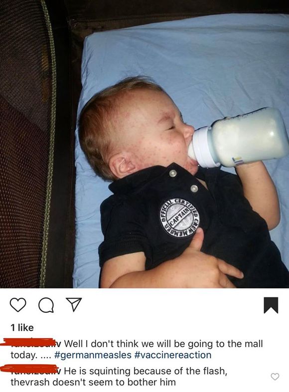 Czarna ręka dziecka z Chorwacji dzień po szczepionce MMR