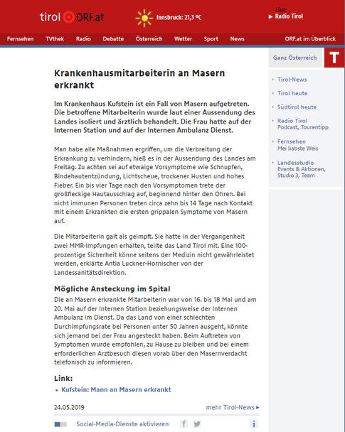 W szpitalu w Kufstein wystąpił przypadek odry. Pracownica dotknięta chorobą, zgodnie z raportem Landu, została odizolowana i poddana leczeniu medycznemu. Kobieta była na oddziale wewnętrznym
