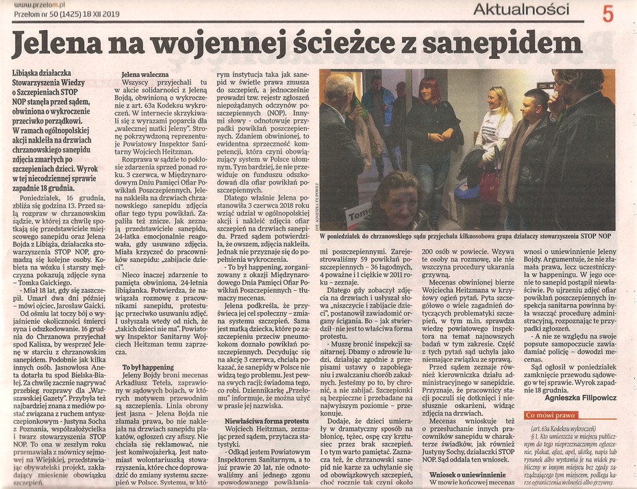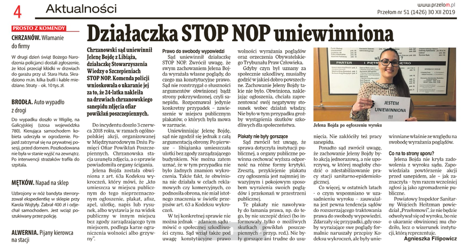 Chrzanowski sąd uniewinnił Jelenę Bojdę z Libiąża, działaczkę Stowarzyszenia Wiedzy o Szczepieniach STOP NOP. Komenda policji wnioskowała o ukaranie jej za to, że 24-latka nakleiła na drzwiach chrzanowskiego sanepidu zdjęcia ofiar powikłań poszczepiennych. Ogłoszony dziś wyrok jest nieprawomocny.