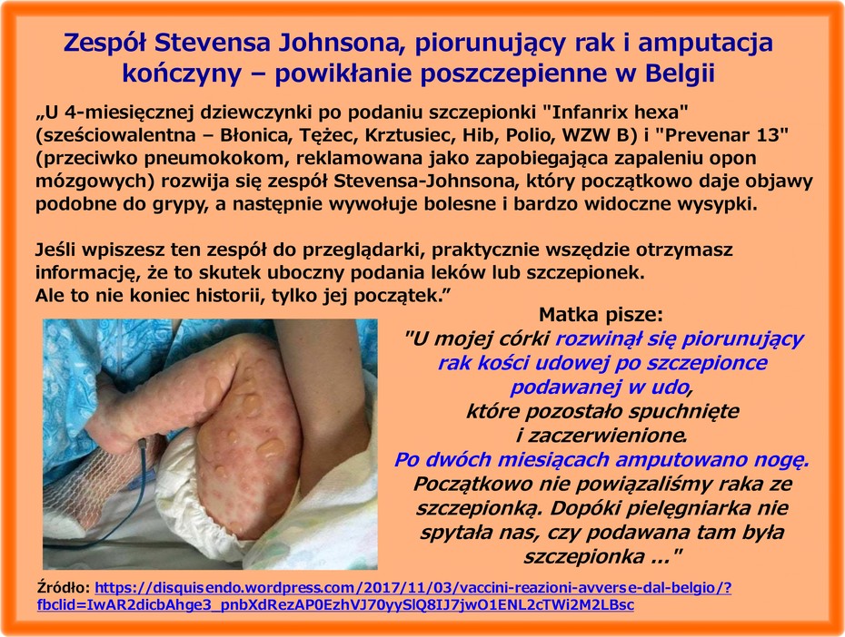 „U 4-miesięcznej dziewczynki po podaniu szczepionki "Infanrix hexa" (sześciowalentna – Błonica, Tężec, Krztusiec, Hib, Polio, WZW B) i "Prevenar 13" (przeciwko pneumokokom, reklamowana jako zapobiegająca zapaleniu opon mózgowych) rozwija się zespół Stevensa-Johnsona, który początkowo daje objawy podobne do grypy, a następnie wywołuje bolesne i bardzo widoczne wysypki.